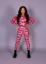 • Contoured Full-Body Unitard: A sleek, form-fitting silhouette showcasing a bold, all-over "Boss" graffiti print in vibrant pink and black. The fabric is designed to contour your body, offering both exceptional comfort and a sophisticated look.