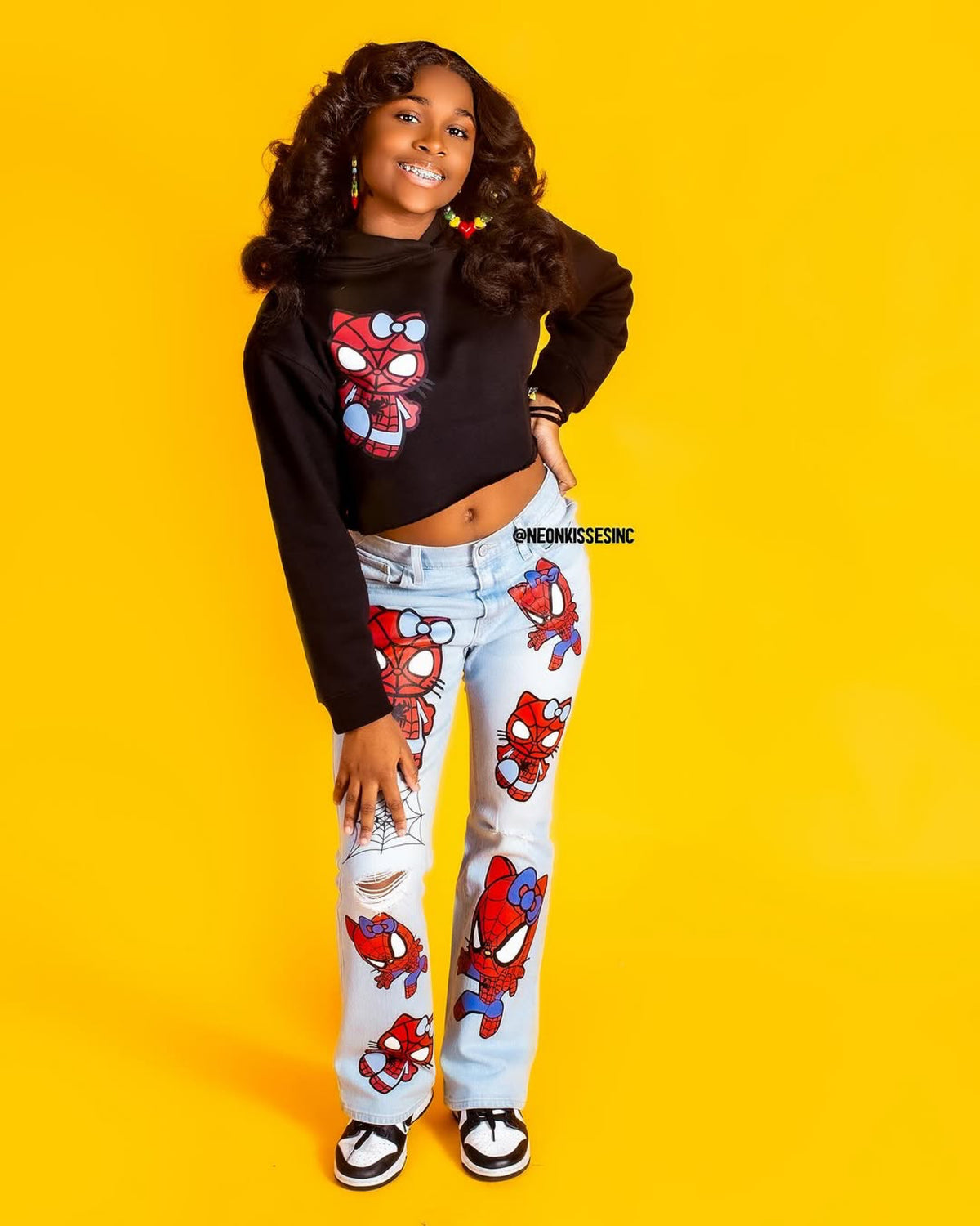 Spider Girl Set! 🕷️ Featuring flared denim jeans with playful Spider Girl prints and a matching cropped hooded sweater, this outfit is perfect for little trendsetters who love to stand out.