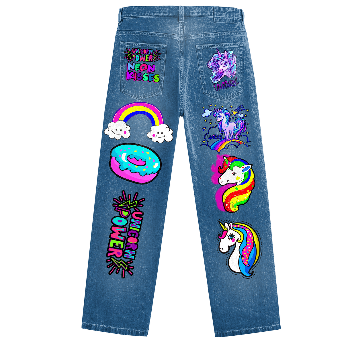 Experience the magic of our Unicorn Power Jeans! These jeans are designed to inspire and empower you with their unique style and fit. Don't just wear them, own them and feel the power radiate from within. Unleash your inner magic in our Unicorn Power Jeans!